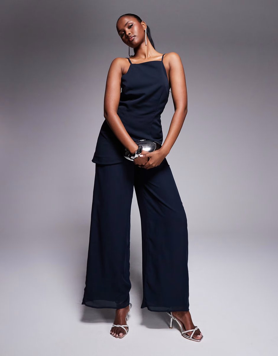 Navy Square Neck Structured Jumpsuit — the versatile statement piece for any occasion. Featuring a square neckline, this structured jumpsuit is designed in navy blue. The wide-leg trousers offer a sleek silhouette, while the chiffon fabric adds a touch of elegance. Ideal for a range of occasions, from smart-casual to evening events. Includes a satin-like finish for a polished look.