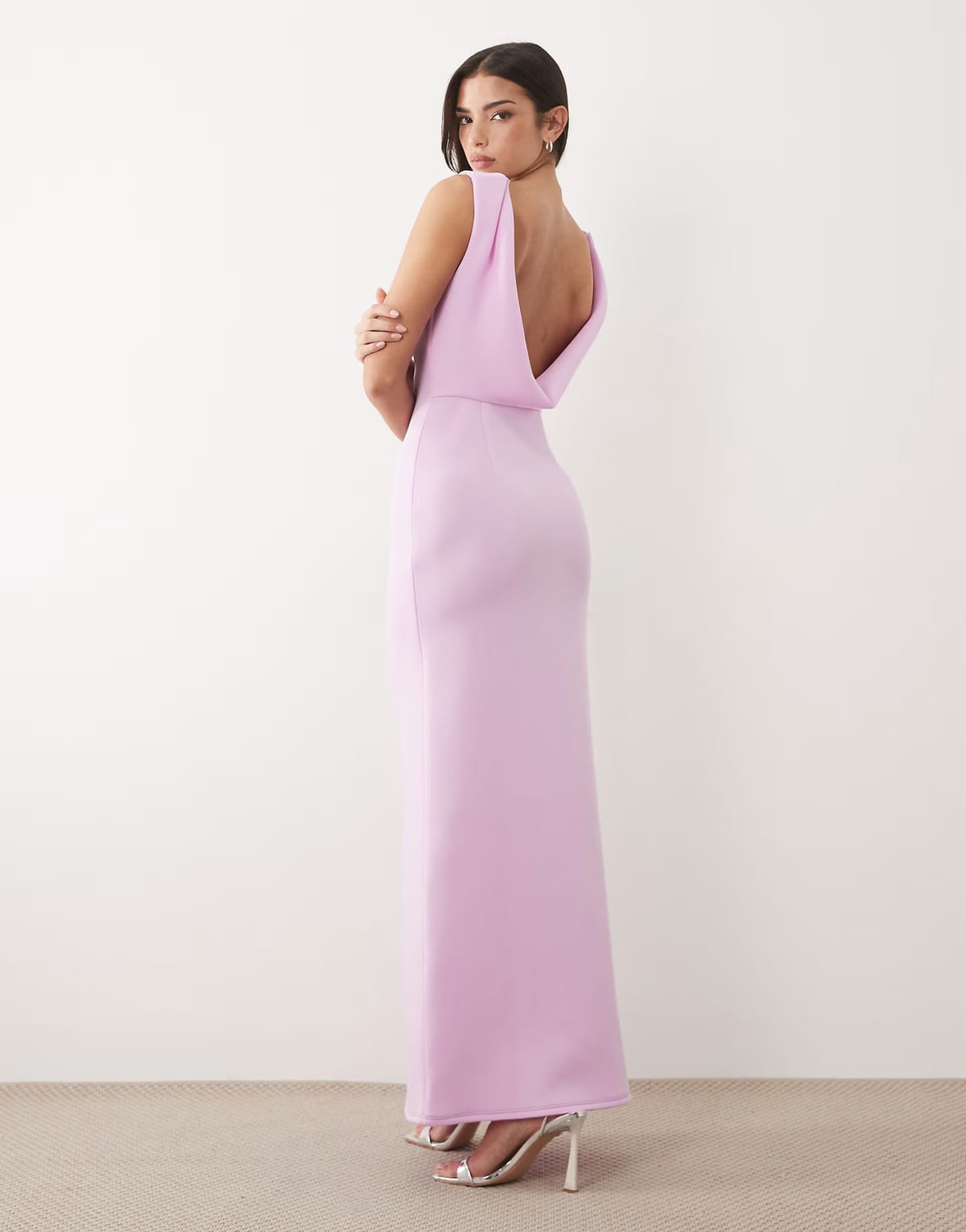 This lilac scuba-style maxi dress by ASOS DESIGN features a structured scoop neck and a sleek open back. The sheer fabric adds a touch of elegance, perfect for evening events.