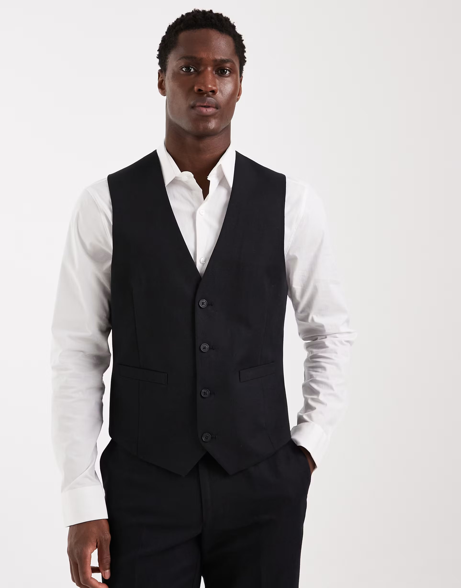 Crafted from black linen rich twill, this waistcoat from ASOS DESIGN is a versatile addition to your wardrobe. Its lightweight fabric and simple design make it perfect for layering over shirts or suits.