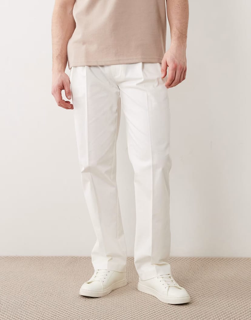 See all outfit ideasSleek white cotton-rich straight leg chino trousers with front pleats. Perfect for a polished, smart-casual look.