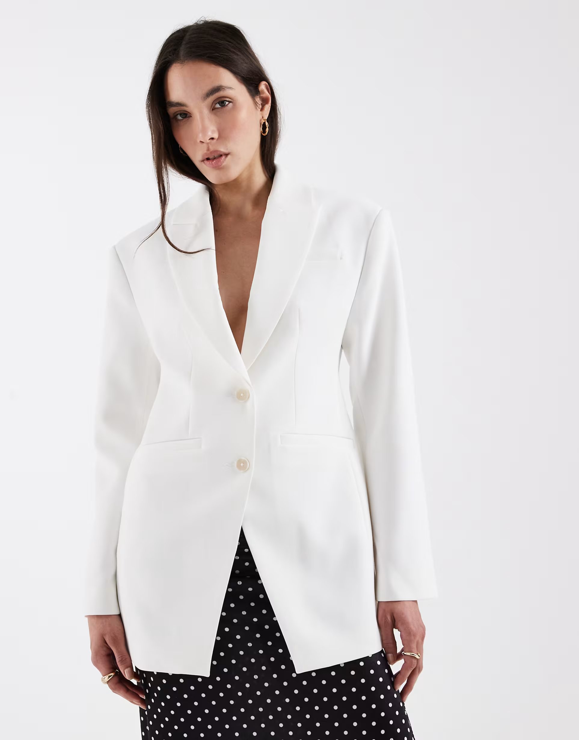 The ASOS Tailored Longline Fitted Blazer in White is ideal for business, evening, smart-casual.