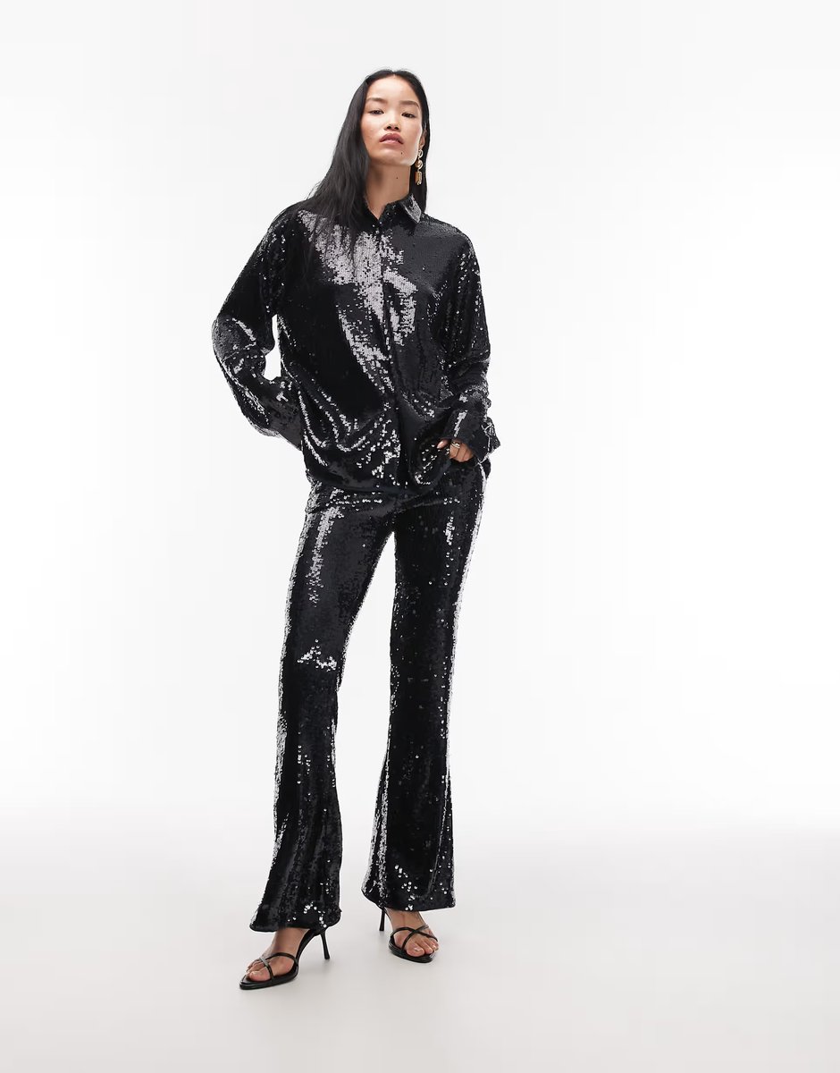 The ASOS DESIGN Navy Sequin Oversized Shirt and Flare Trousers Set is ideal for party, evening, formal.