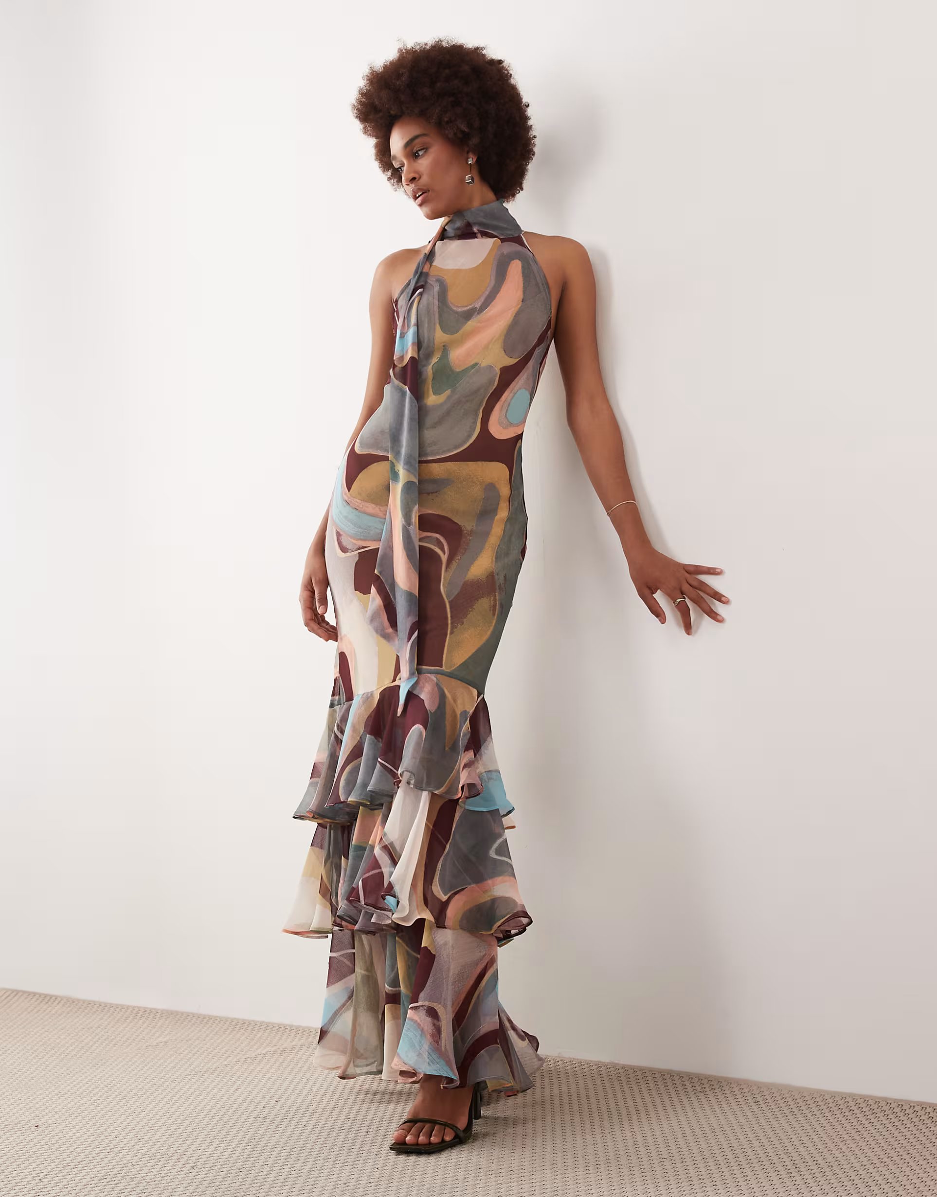 The ASOS Halter Neck Maxi Dress in Burgundy Abstract is made from chiffon.