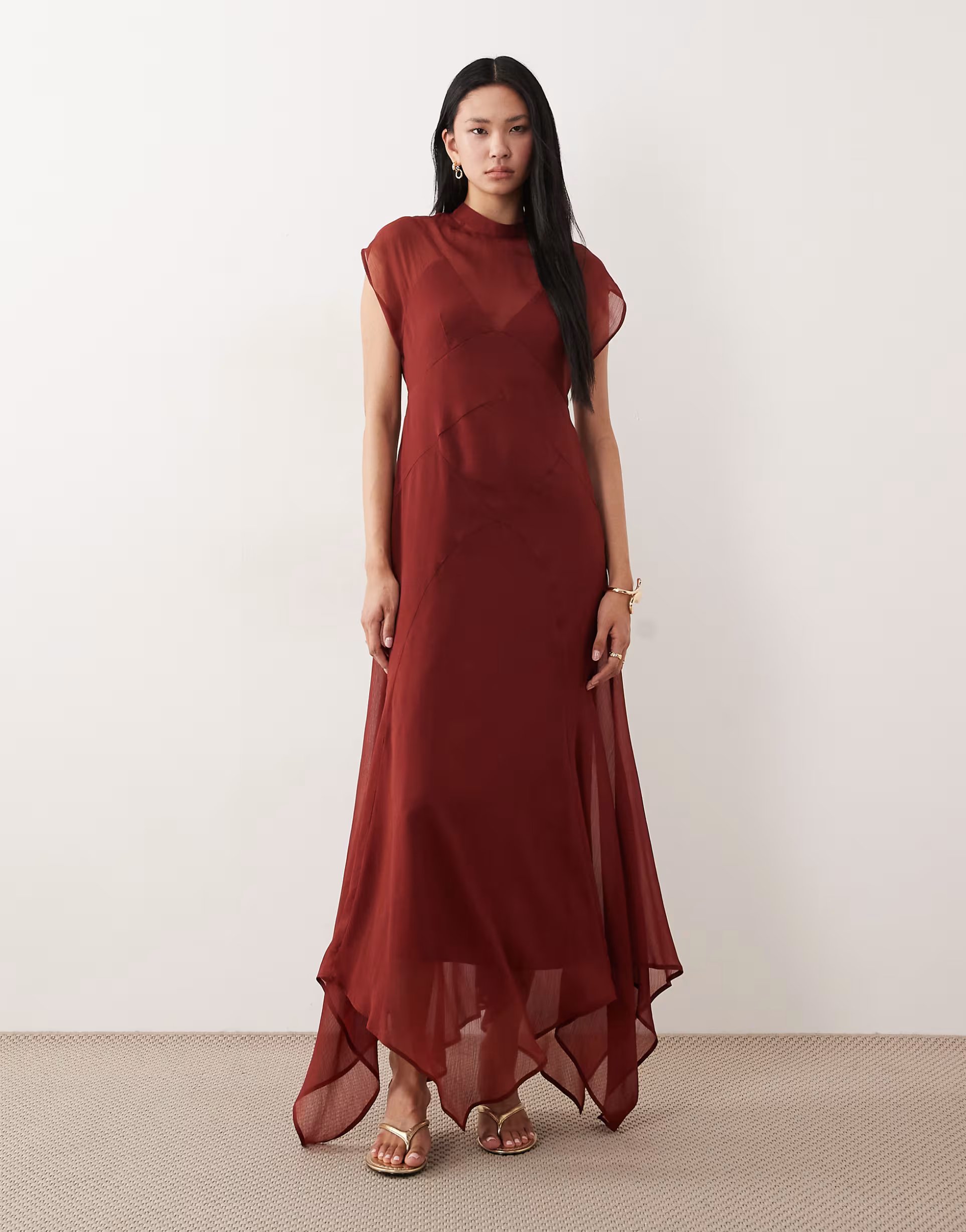 Elegant deep rust maxi dress with high neck and hanky hem, made from chiffon fabric.