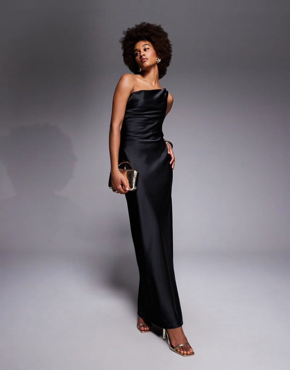 The ASOS DESIGN Black Satin One Shoulder Asymmetric Maxi Dress is available in sizes XXXL, XXL, XL, XS, L, M, S.
