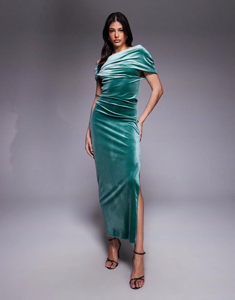 The ASOS Velvet Midi Dress with Fallen Shoulder in Teal is ideal for evening, date-night.