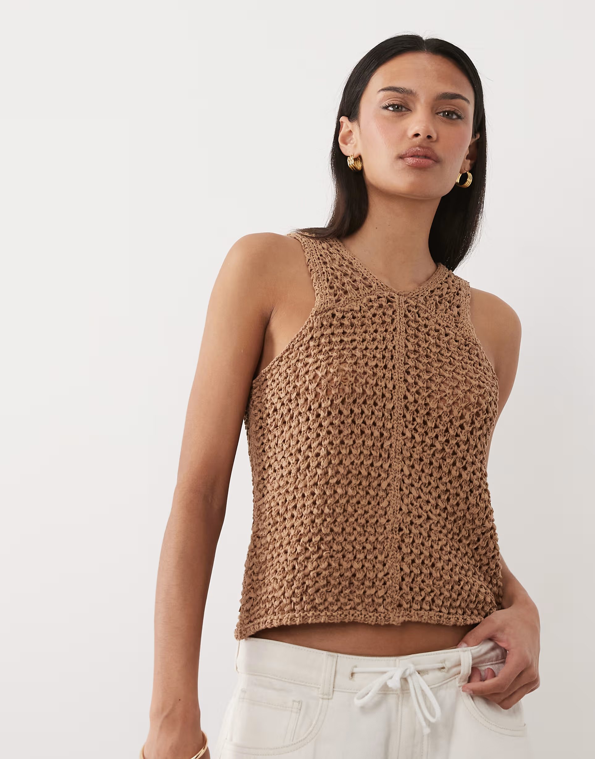 The ASOS Crochet Vest in Toffee is made from tape yarn.
