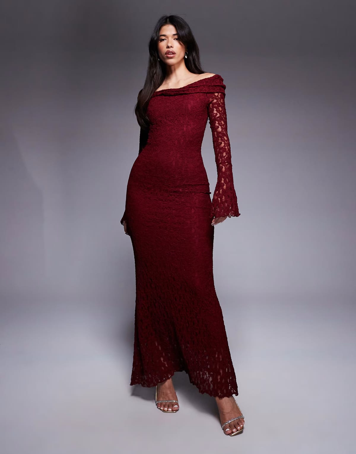 The ASOS Bardot Lace Maxi Dress in Dark Cherry is ideal for evening, formal.