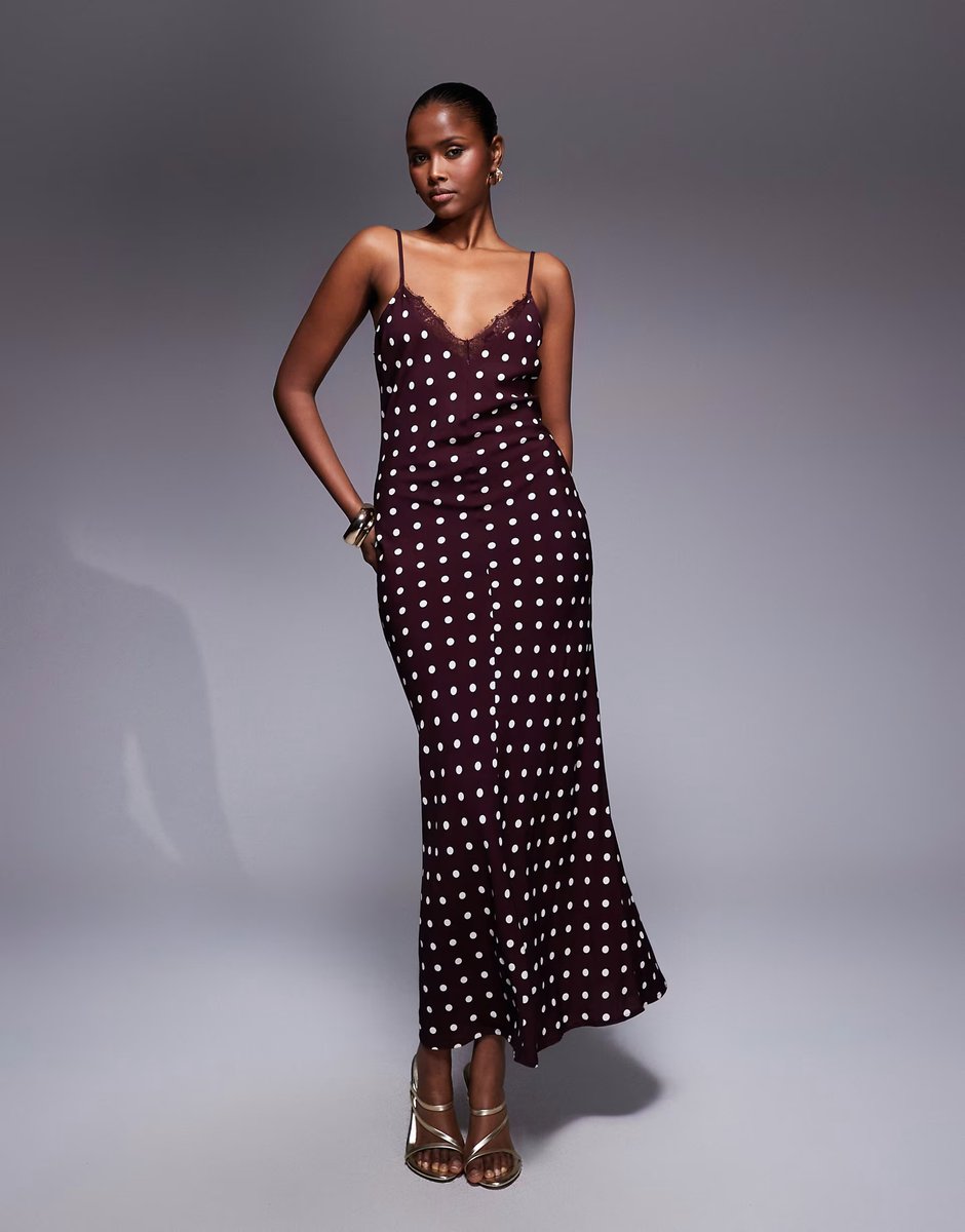 The ASOS DESIGN V Neck Lace Trim Satin Slip Maxi Dress in Chocolate Spot is ideal for evening, party, date-night.