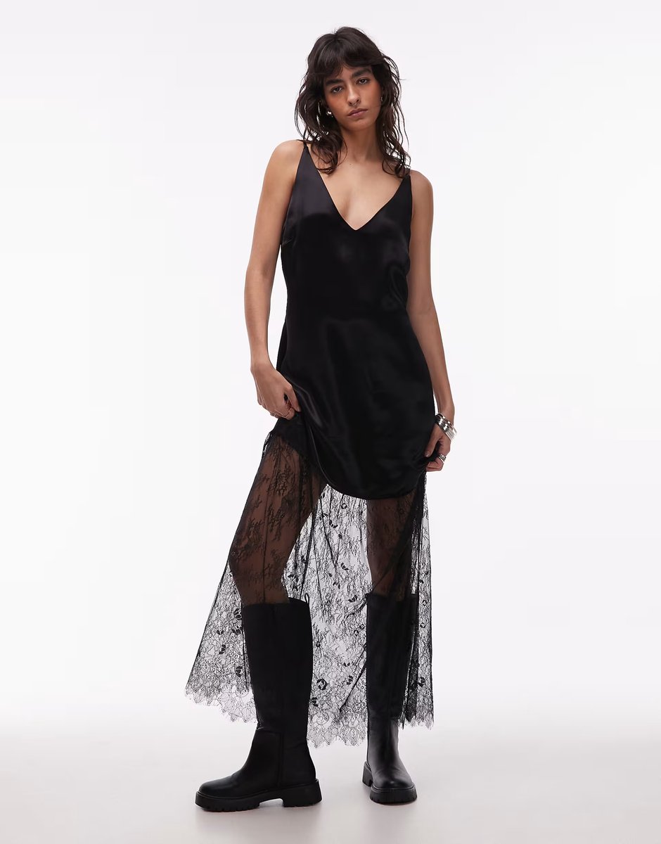 The perfect black maxi dress for your evening events and formal occasions. This sleek v-neck satin slip dress has a chic lace skirt that adds a touch of elegance. The satin fabric with a sheen finish makes it a standout piece. Ideal for dinner parties, cocktail hours, and elegant gatherings.