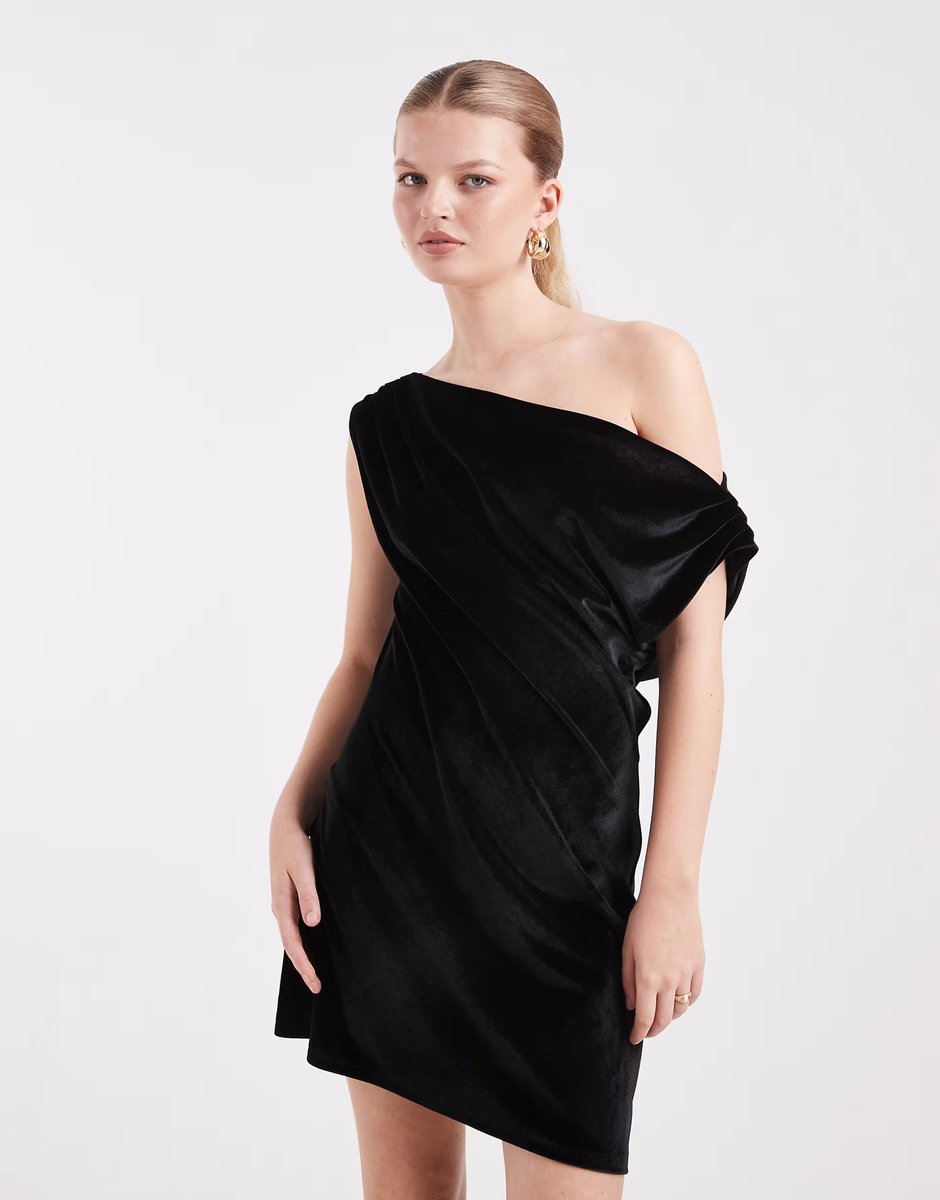 The ASOS Velvet Drape One Shoulder Mini Dress in Black is ideal for evening.