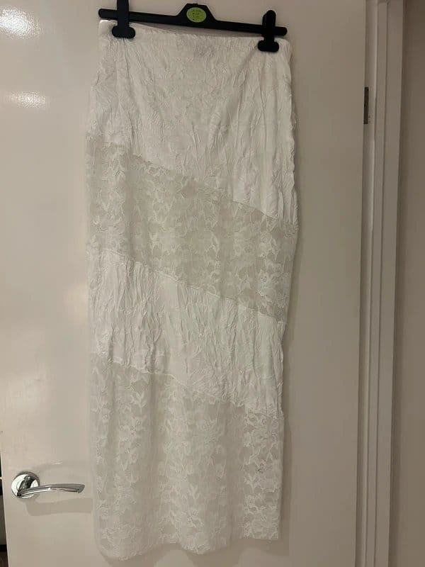 View Vinted's returns policyThis ASOS Design white lace maxi skirt features a satin feel material and silk for a luxurious look. Ideal for a wedding or special occasion.