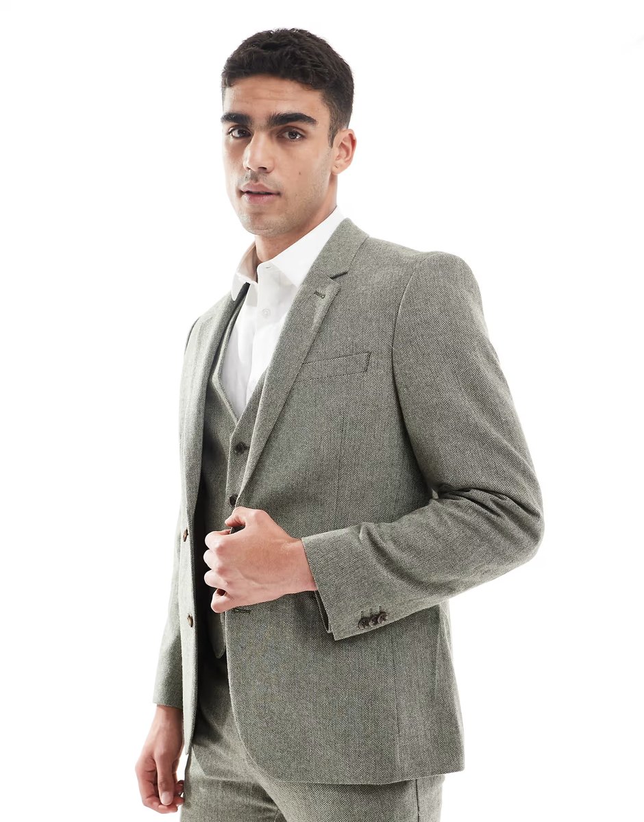 The ASOS DESIGN Wool Rich Slim Suit Jacket in Green Herringbone is ideal for smart-casual.