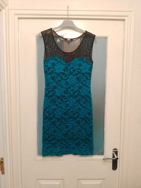 View Vinted's returns policyStylish teal lace bodycon midi dress by ASOS. Features a sweetheart neckline and sheer mesh panels for a touch of allure. Perfect for holidays and clubbing.
