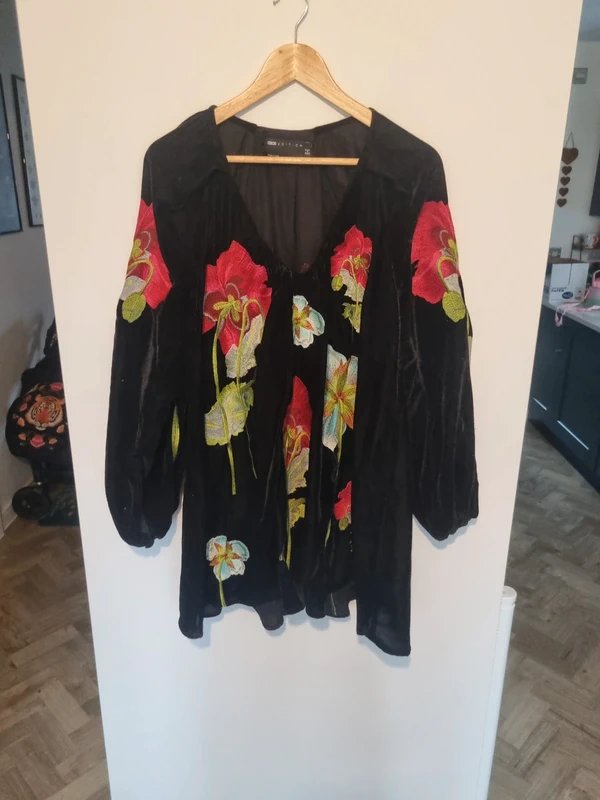 So flattering. Size 8 but could also fit a 10 to 12 due to trapeze style. Gorgeous embroidery in black velvet, long sleeves, round neckline, loose fit with floral embellishments