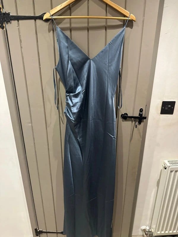 The ASOS Edition Blue Satin Dress with Slit is available in sizes M.