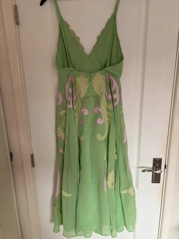 “Pair with gold hoop earrings and mint green strappy heels for a cohesive look.”