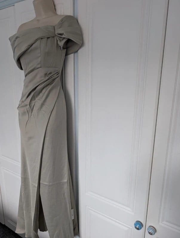 This ASOS dress features a satin fabric with a Bardot neckline and drapey wrap design. The sage green colour adds a unique touch, perfect for evening events or special occasions.