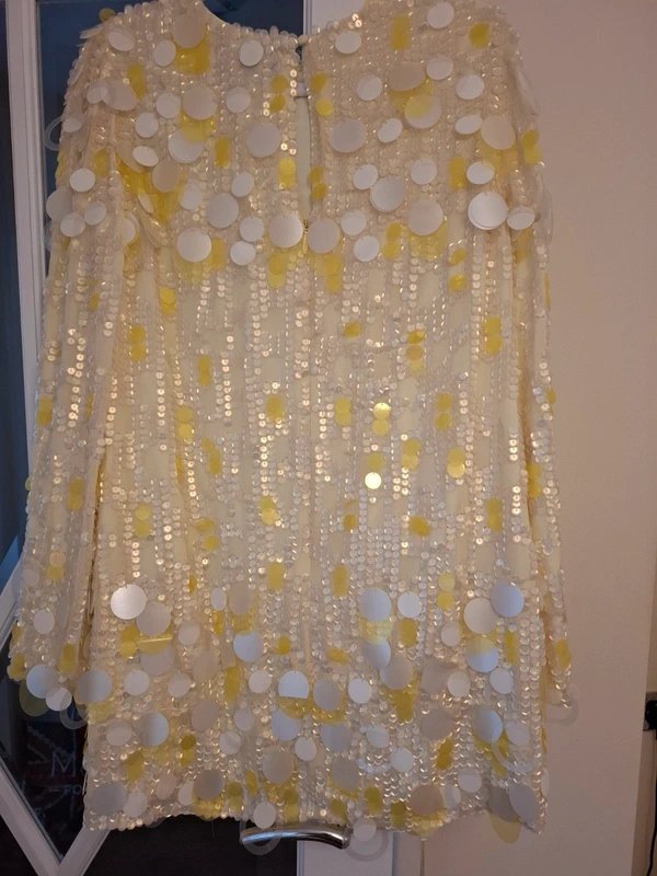 Gorgeous heavy lemon/cream sequin shift with an extensive assortment of sequins. Fully lined, this dress is immaculate and perfect for Christmas parties.