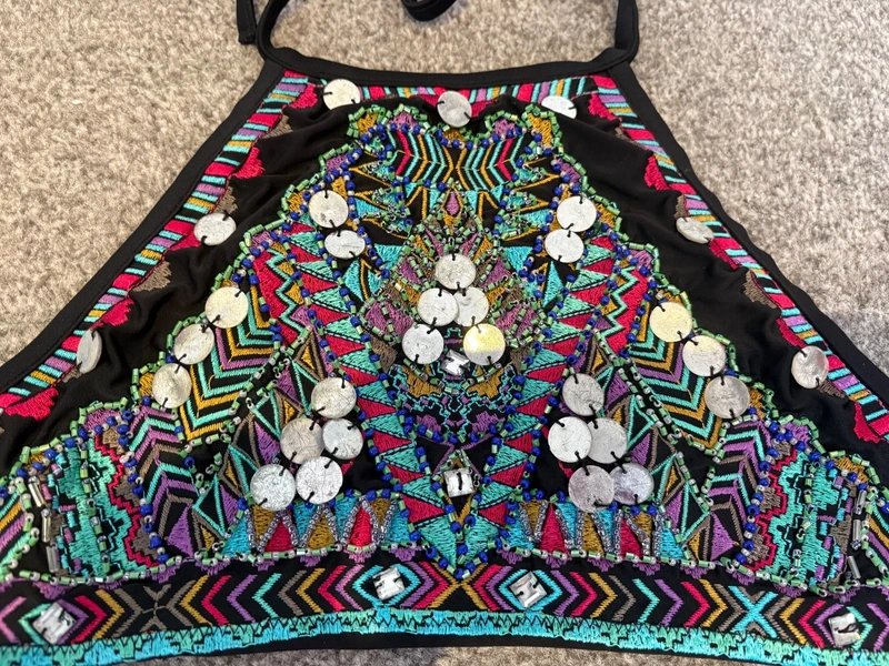 A beautiful beaded crop halter bikini top, perfect for summer holidays, festivals, clubbing and nights out under a smart jacket. Can be worn in a multitude of ways as it’s not an obvious bikini top.