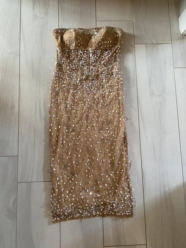 This beige embellished midi dress from ASOS features a sheer bodice with beads and sequins for a glamorous look. Perfect for evening events or special occasions.