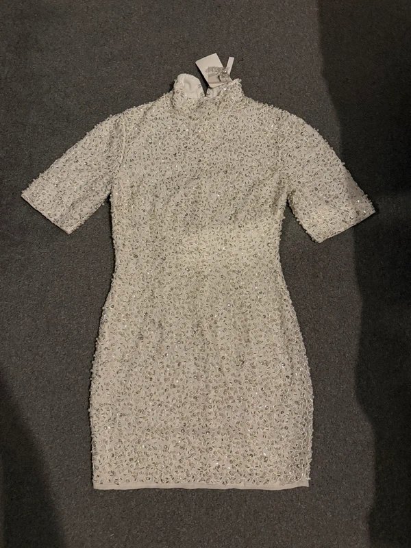This mini dress by ASOS is adorned with pearls for an elegant touch. Crafted from beaded material, it features a round neckline and short sleeves for a feminine look.