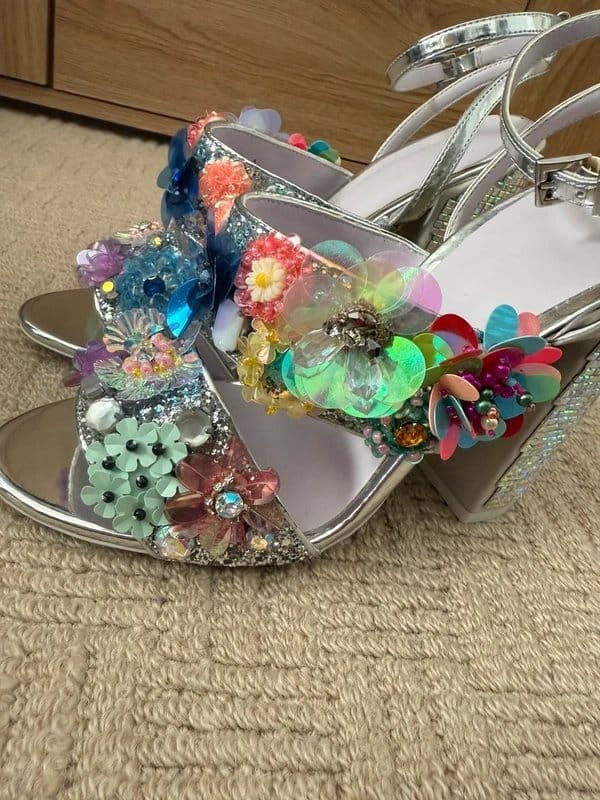 Vibrant multi-coloured embellished high heels by ASOS. Featuring a silver metallic base with a variety of floral and crystal decorations. Perfect for adding a pop of colour to any outfit.