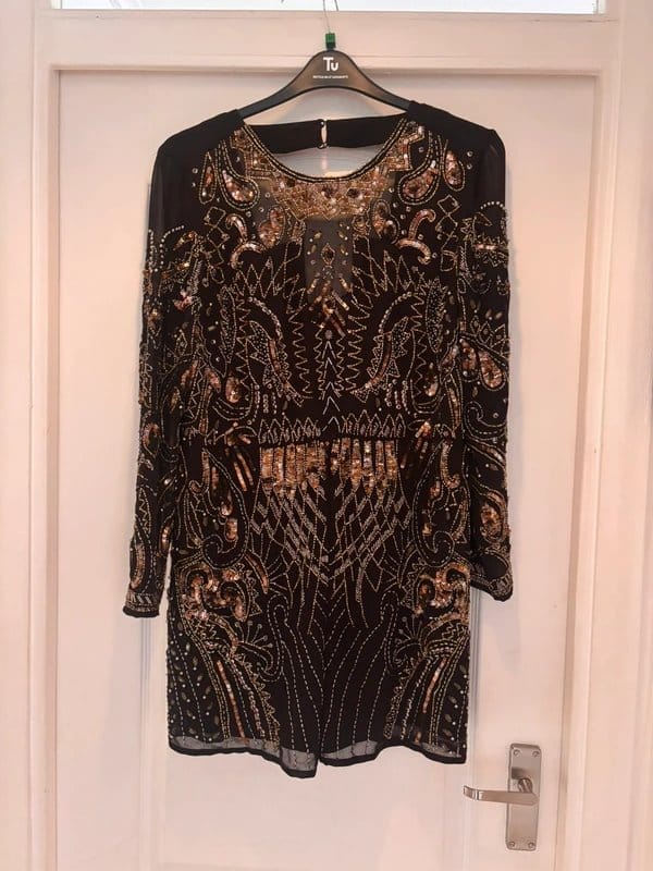 Glamorous black embellished playsuit with gold beads and sparkling details. Features a fitted bodice and a flared skirt. Perfect for evening events or special occasions.