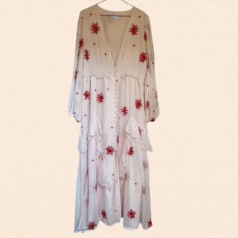 Designed with an embroidered floral pattern, this maxi dress offers a romantic touch with its v-neckline and long sleeves. Perfect for casual and weekend wear.