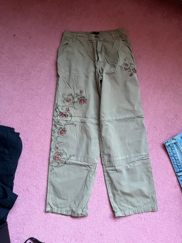 Adorned with red and green floral stitching, these khaki green straight leg trousers are a perfect blend of casual and chic. Designed with a relaxed fit, they are ideal for a variety of occasions.