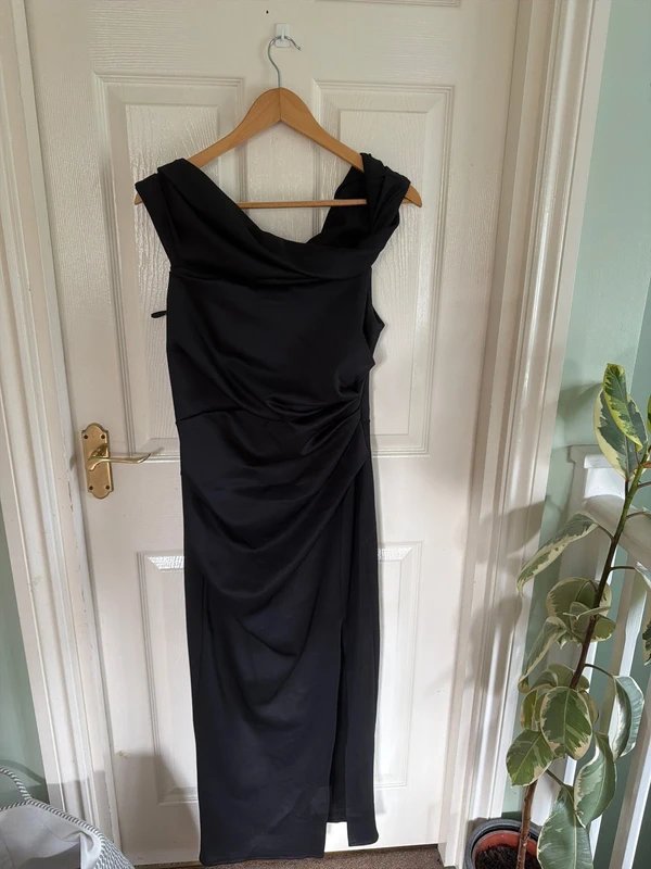 Long black off-the-shoulder evening dress from ASOS with ruched detailing and a front side split. Designed in deep black, this long dress features off-the-shoulder neckline, ruched detailing, and a front side split for a dramatic look. Crafted from lightweight satin with a sheer finish, it adds a touch of elegance to any evening event. Perfect for evening events, cocktail parties, and formal occasions.