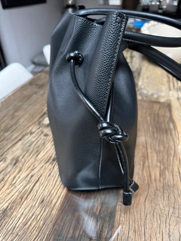 A chic black shoulder bag featuring a drawstring closure and toggle detailing. Its large loop handles make it ideal for carrying on or off the shoulder. The bag is lined with felt and secured with a metallic clip fastening.
