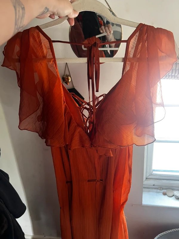 This adjustable floaty chiffon dress by ASOS features a bohemian style. The dress is perfect for warm weather and has a flattering fit. Ideal for casual outings and beach parties.