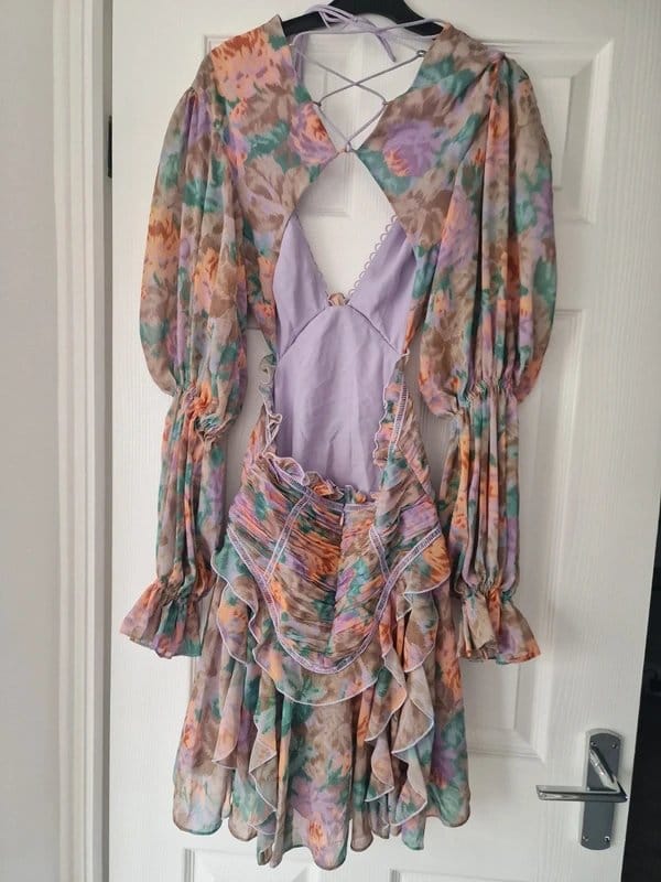 This ASOS mini dress features a floral print in multi-colours, a cut-out back with lace-up detailing, and a bohemian-inspired silhouette. Perfect for casual outings or summer festivals.