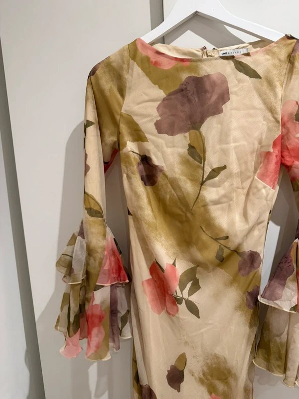 The ASOS Floral Print Long Sleeve Maxi Dress with Ruffles is available in sizes S.