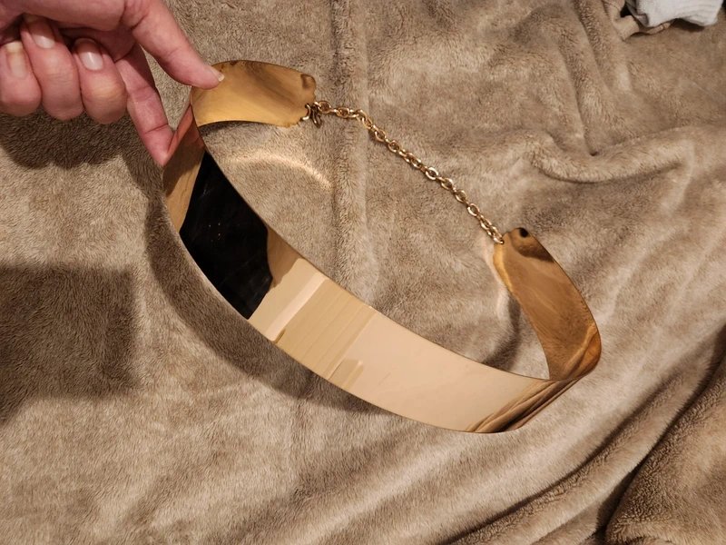 Thick golden metal belt from ASOS. Adjustable and perfect for adding a touch of luxury to your outfits. Ideal for pairing with dresses or a corset. Features a slight scratch, but it's not very noticeable.