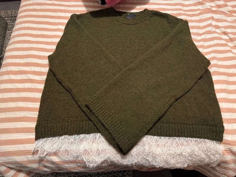 Stylish ASOS dark green knit jumper with a delicate lace illusion skirt at the bottom. Perfect for a casual chic look.