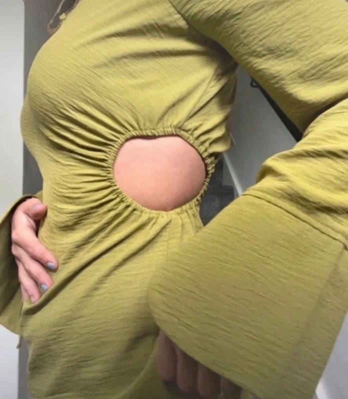 The ASOS Green Off Shoulder Halter Neck Dress with Cut Out Side is made from Cotton.