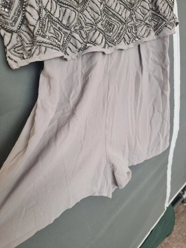 The grey embellished playsuit by ASOS features intricate embellishments and a sheer neckline. It offers a relaxed fit, perfect for casual or evening wear.