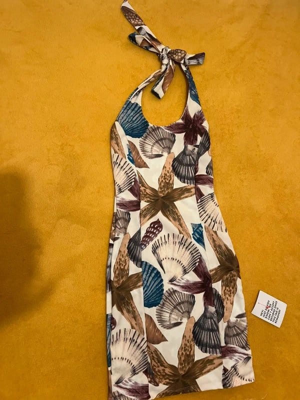 This ASOS Shell Print Halter Neck Mini Dress is perfect for summer parties and beach outings. The floral shell print adds a playful touch, while the halter neck and adjustable tie provide a flattering fit. Crafted from lightweight fabric, it offers comfort and breathability. Ideal for casual gatherings and beachside events.