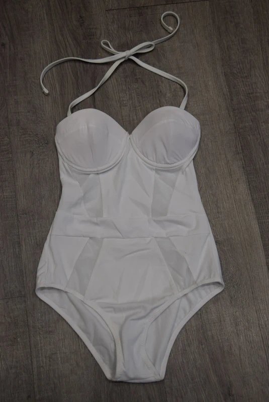 The ASOS Halter Neck Padded Swimsuit in White is available in sizes S.
