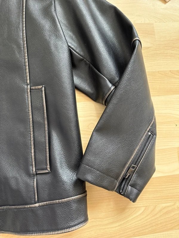 Crafted from heavyweight leather, this oversized Harrington jacket in a brown hue is perfect for layering during cooler days. Its timeless design adds a touch of ruggedness to any outfit.