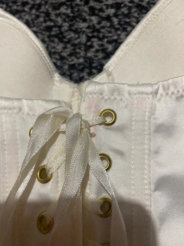 This ivory crème corset features a strapless design that adds an elegant touch to any outfit. The fabric has a smooth texture, perfect for a polished look.