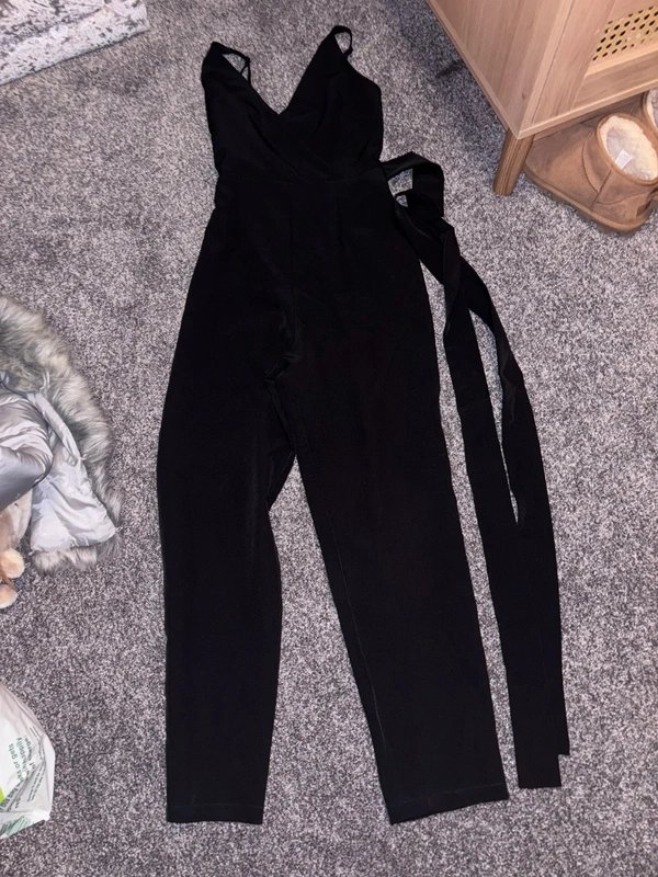 This black jumpsuit features a strap detail and a tie piece round the body, giving it a playful yet sophisticated vibe. Ideal for casual outings or a relaxed evening.