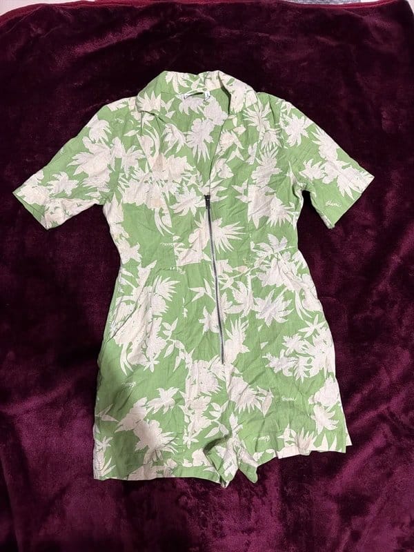 See all outfit ideasPlayful mint green floral jumpsuit by ASOS, perfect for summer. Features a full-length zipper and a lightweight breathable fabric with a tropical print. Ideal for casual outings or beach days.