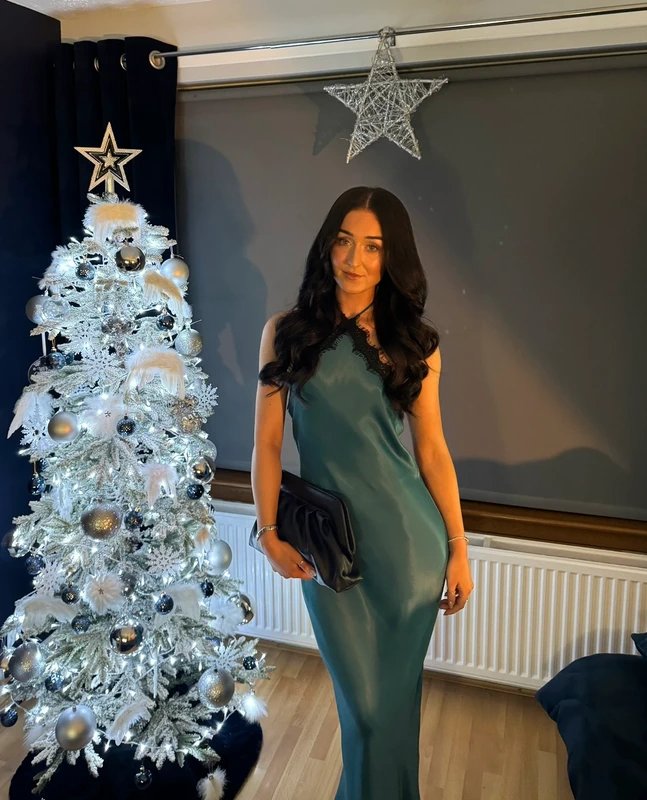 Elegant and sophisticated, this ASOS lace halter dress features a V-neckline, sheer lace detailing, and a seamless silhouette. Perfect for a night out or special occasions.