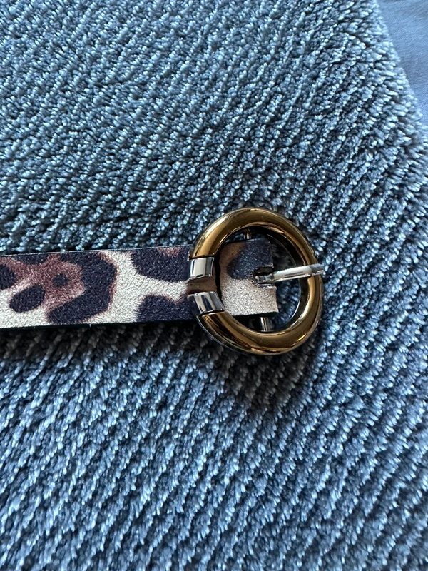 Designed in leopard print, this soft material belt features gold detailing. Perfect for adding a touch of wild elegance to any outfit.