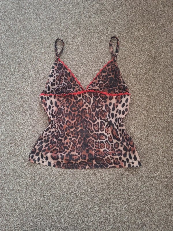 The ASOS Leopard Print Strappy Cami Top with Red Lace is available in sizes S.