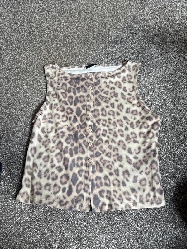 This ASOS top features a bold leopard print in shades of brown and beige. The sleeveless design and button-front closure make it a versatile piece for casual wear.