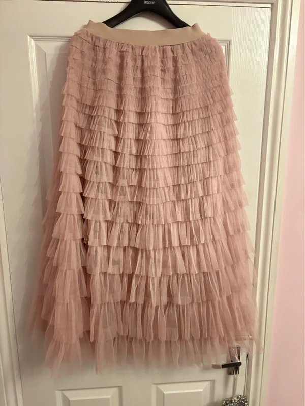 The ASOS Blush Pink Ruffled Tiered Maxi Skirt is made from tulle.